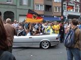 Nur einmal wäre es fast zu einem Zwischenfall gekommen: Ein tiefergelegter Fiesta mit Gelsenkirchener Kennzeichen und vielen Schalke-Aufklebern und Deutschland-Fahnen bahnte sich seinen Weg über die Kreuzung. Der quadratisch geformte Beifahrer muss eine Bemerkung falsch verstanden haben, und hüpfte mit erhobenen Fäusten aus dem Auto. Dann stand er da vor mehreren Reihen lachender Menschen, die ihm fröhlich zuprosteten. Das Gesicht, mit dem er wieder in das Auto plumpste, vergesse ich so schnell nicht.