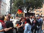 Die Musikanlage wurde auf Vollast hochgefahren, die ganze Kreuzung sang und tanzte. Gegenüber, am "Fiasco", wurden reichlich Deutschland-Fahnen geschwenkt, Presslufttröten gezückt, und vereinzelte "Deutschland, Deutschland"-Rufe verplätscherten in der kochenden Samba-Stimmung.